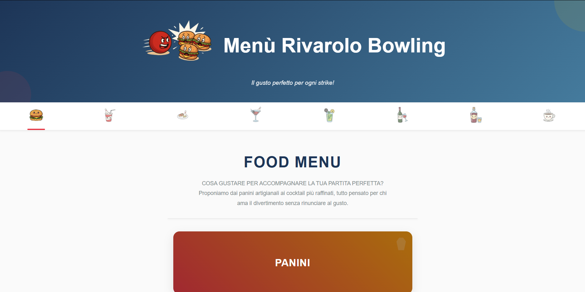 Ho creato un sito web interattivo per il Bowling Rivarolo, collegato direttamente al menu tramite QR code. L’utente può scansionare il codice e accedere rapidamente a tutte le informazioni sui piatti e le bevande disponibili. Il sito è stato realizzato con HTML, CSS e JavaScript, con attenzione a design chiaro, navigazione semplice e responsive, perfetto per consultare il menu da qualsiasi dispositivo.